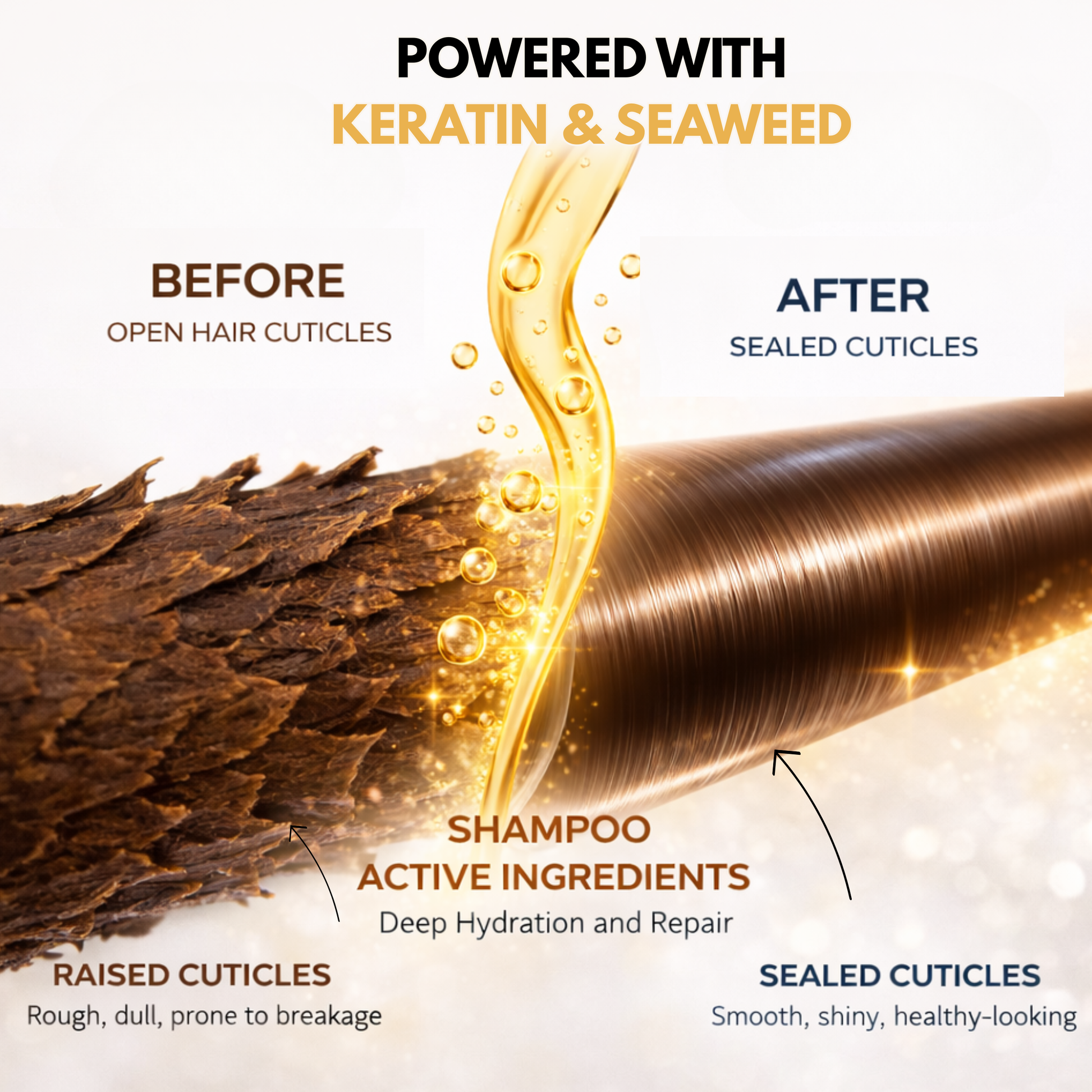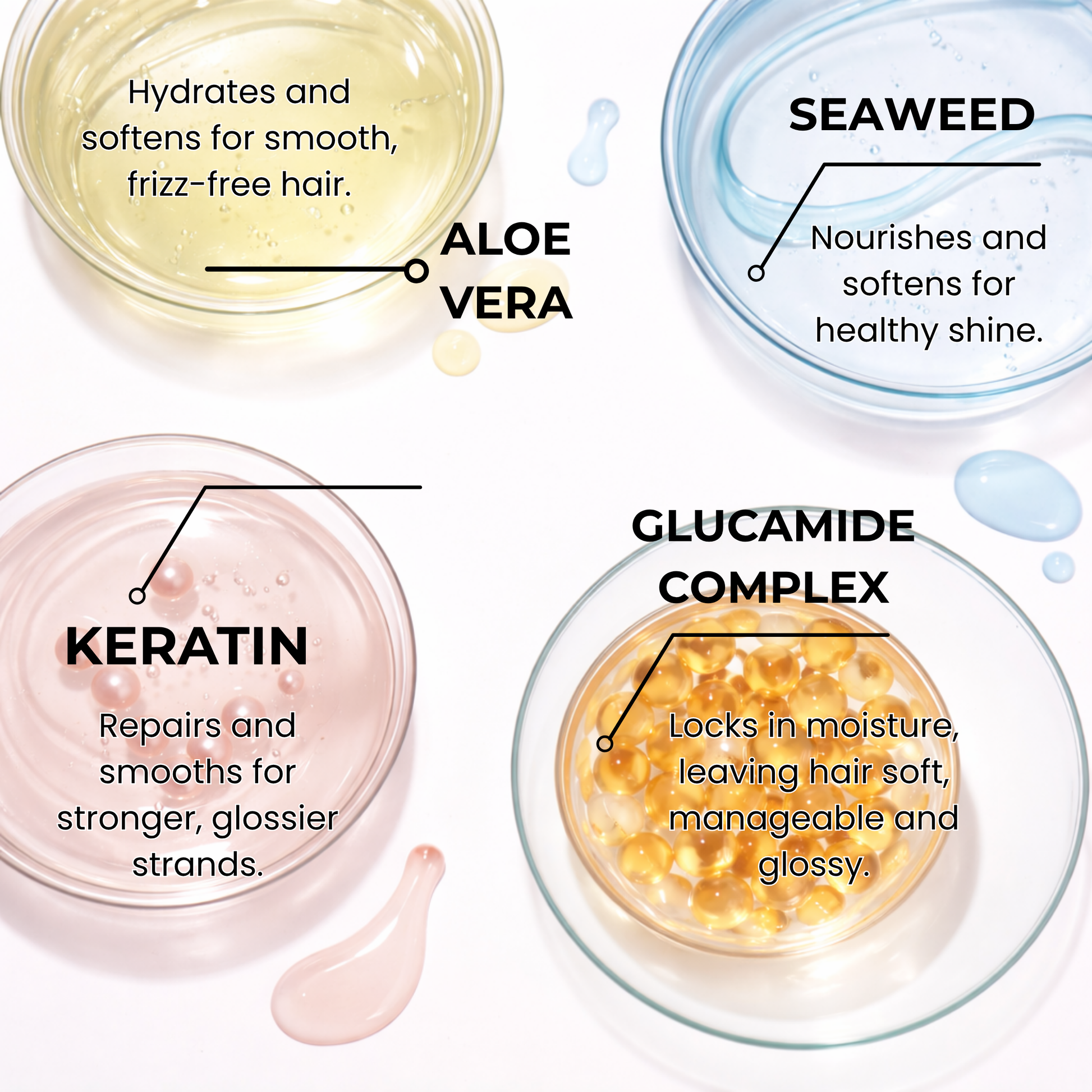 - Keratin - A strengthening protein that helps smooth the hair fibre and reduce breakage.